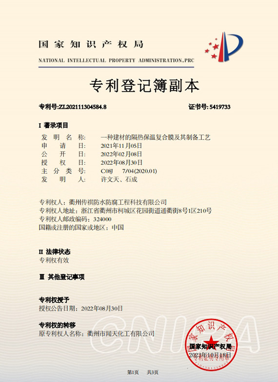 衢州傳祺新材料科技有限公司是衢州市聞天化工有限公司的下屬企業(yè);衢州市聞天化工有限公司成立于2003年,是國內(nèi)最早研發(fā)、生產(chǎn)氟碳涂料的企業(yè)之一。衢州傳祺新材料科技有限公司成立于2017年,公司專注于高分子氟材料的開發(fā)和含氟材料在防腐、防水領(lǐng)域的應(yīng)用。經(jīng)過6年的不懈努力,已獲得了化工和建筑領(lǐng)域六項國家發(fā)明專利授權(quán)和兩項新產(chǎn)品科技成果獎,參與了中國建筑材料流通協(xié)會《房屋修繕防水工程規(guī)范》標準的編制工作,中建協(xié)涂裝委員會浙西工作站設(shè)立在我公司。